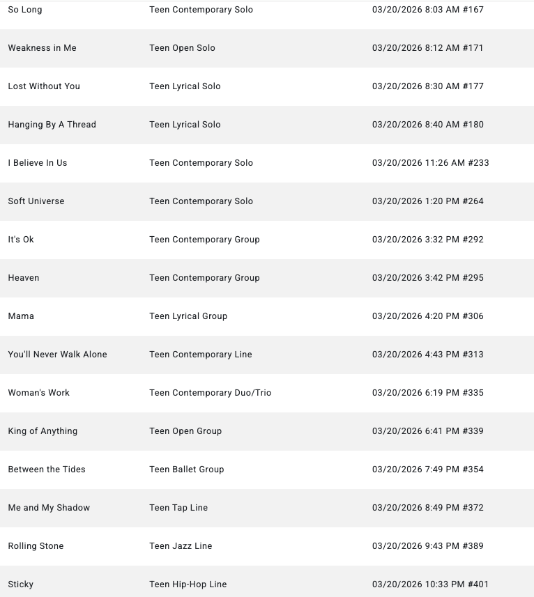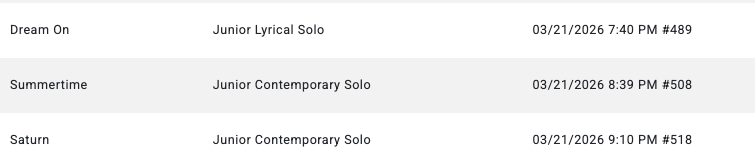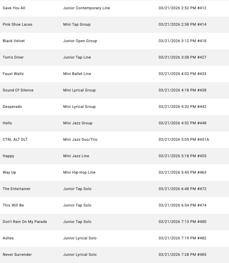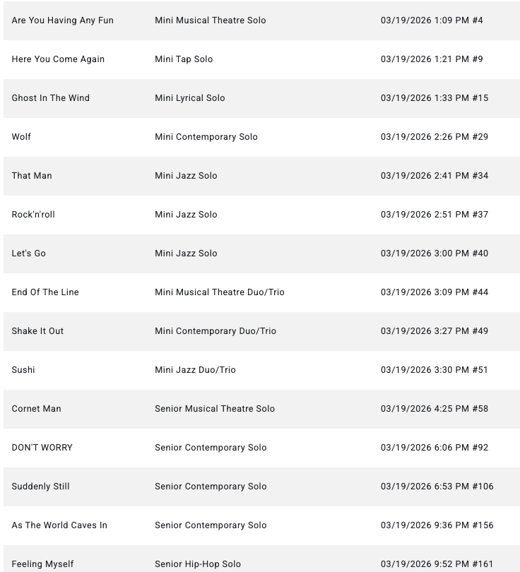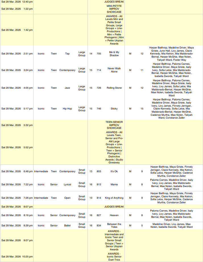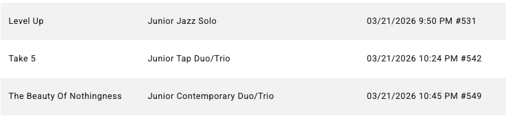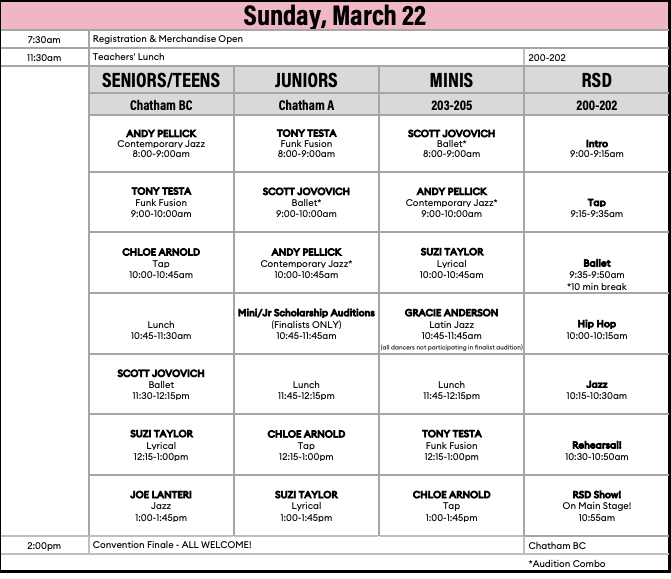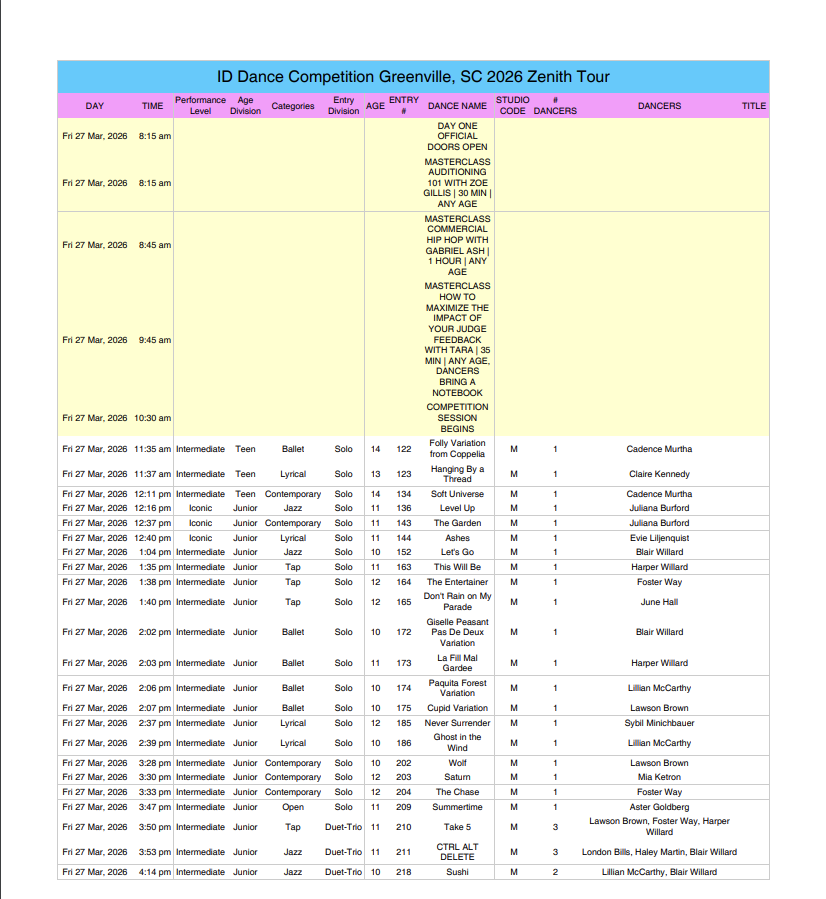 GROUPS- Please arrive 2hrs before below call time SOLOS- Please arrive 1.5hrs before below call time Hair & Make-up done NYCDA SCHEDULE Thursday- March 19 Friday- March 20 Saturday- March 21 ID Dance CompetitionGREENVILLE CONVENTION CENTERCONFERENCE HALL1 Exposition DrGreenville, SC 29607